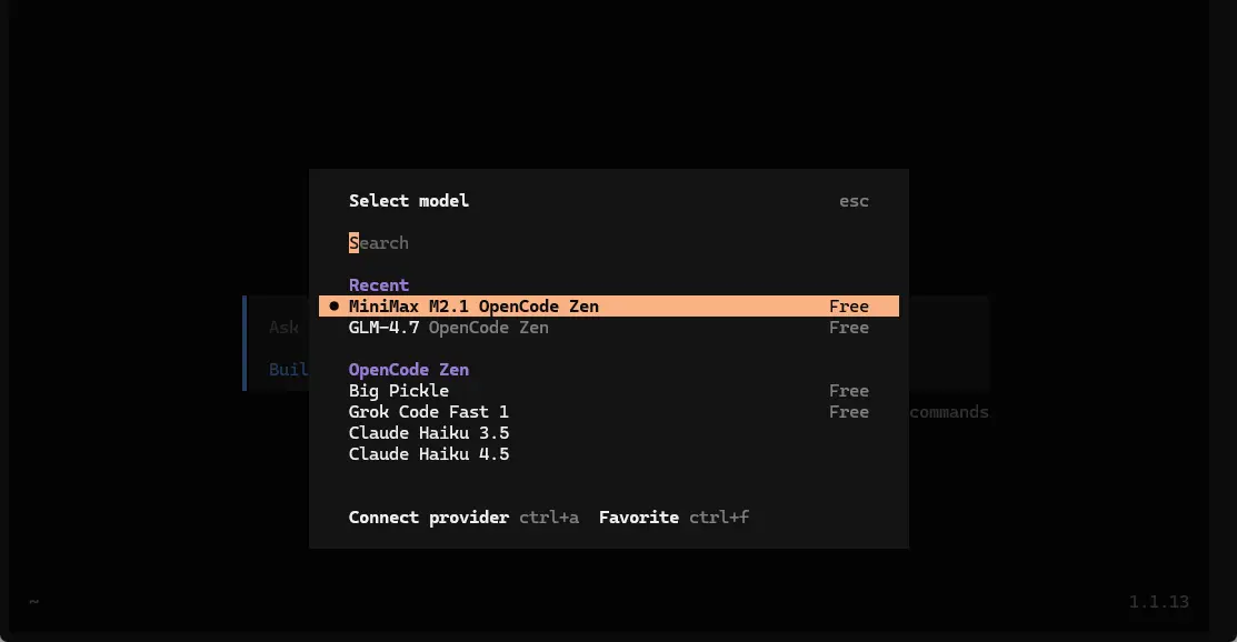 我们输入/connect指令,可以看到OpenCode可用的模型提供商。OpenCode内置支持了许多模型提供商,许多流行的公网LLM API都可以在这里使用,我们也可以接入自己部署的LLM。不过本着~~能白嫖就白嫖~~的原则,OpenCode自己的OpenCode Zen目前有免费试用,其中国产的GLM 4.7和MiniMax M2.1可以不用付费直接使用,下面都以这些免费模型作为例子演示。