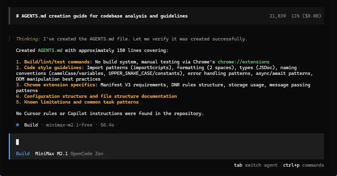 虽然上面的AGENTS.md是瞬间自动生成的,但实际上它非常重要,AGENTS.md有误或信息不全很可能导致后续智能体的工作流程或编写的代码存在错误。当然,对于简单的项目,LLM生成的AGENTS.md已经差不多够用了,然而对于更复杂的项目,我们可能需要深度手写AGENTS.md,准确的描述所用技术栈、项目结构、代码风格、工作流程以及更多的关键信息。如果是完全新建的项目,我们通常也可以手动编写AGENTS.md以正确的指导编码智能体该怎么做。