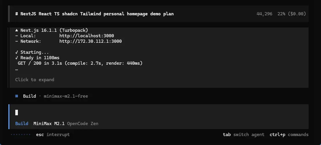 当Plan模式输出的计划已经满足我们的需求时,我们就可以把OpenCode切换到Build模式开始编码了,现在我们唯一需要的就是等待(或者规划下一个项目、摸鱼、看猫猫视频、喝茶、睡觉...),编码智能体会自动写入文件、执行Bash命令,直到最终完成工作。