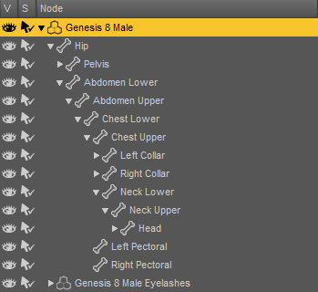 DAZ Studio软件中的内容选取以骨骼节点树形结构组成的物体为主,因此我们完全可以直接在右侧的节点列表中选择我们需要调整的物体或物体的骨骼。