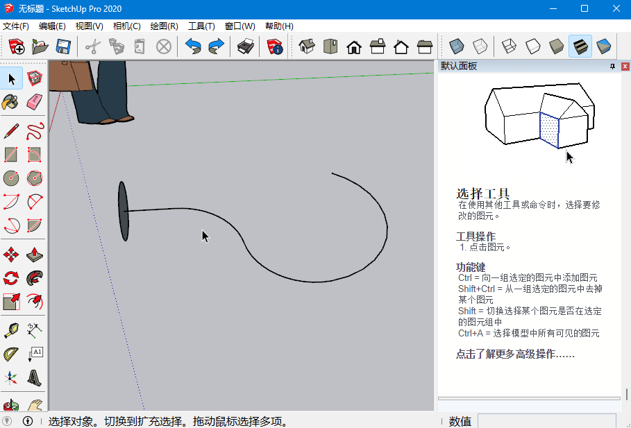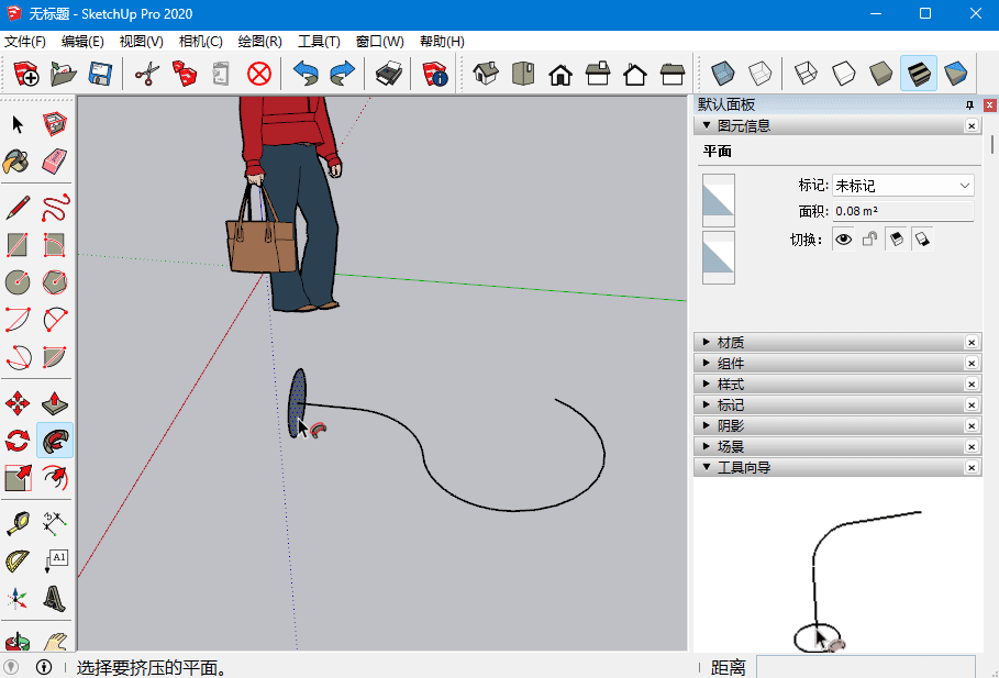 有时沿着路径拖动其实比较难操作,我们还可以先用选择工具选中路径,然后点击路径跟随工具,此时再点击挤出面,这样挤出面就会自动沿着路径挤出了。