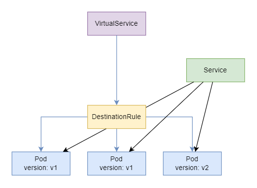 DestinationRule:流量路由到目标地址后,由目标规则定义具体路由到某一个服务实例(通常是k8s中Deployment定义的Pod)上。