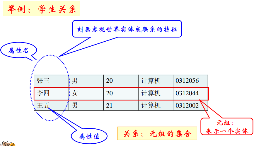 一个关系的任何当前值是该关系的实例。如(张三,男,20,计算机,0312056)就是一个实例。这就像面向对象编程中类和实例之间的关系。