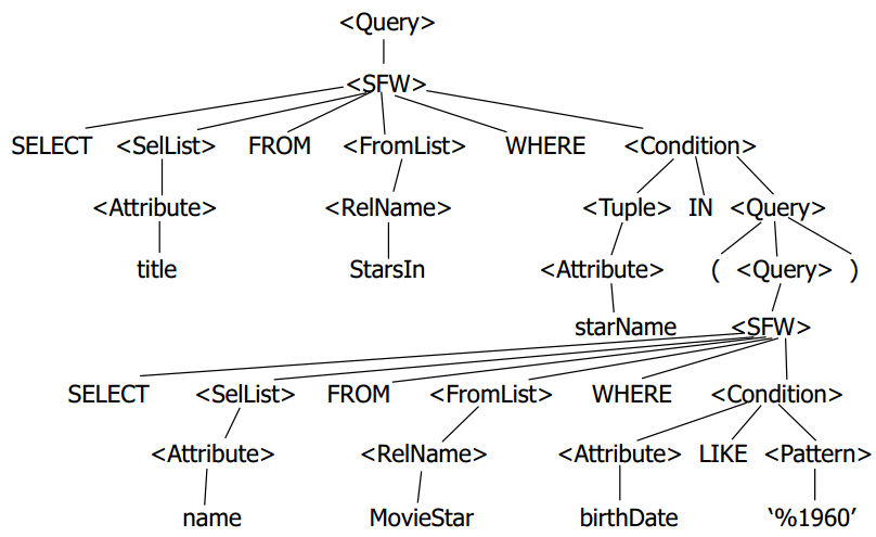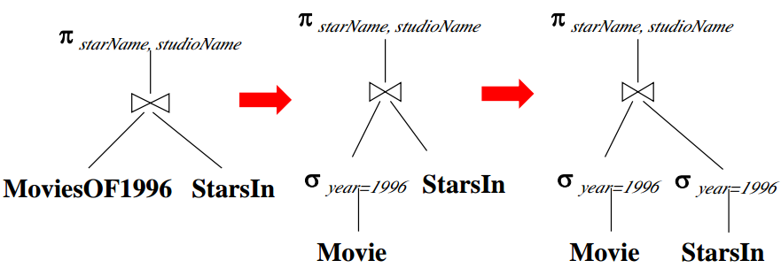 - 逻辑查询计划树:由基本关系代数操作符组成的查询计划树