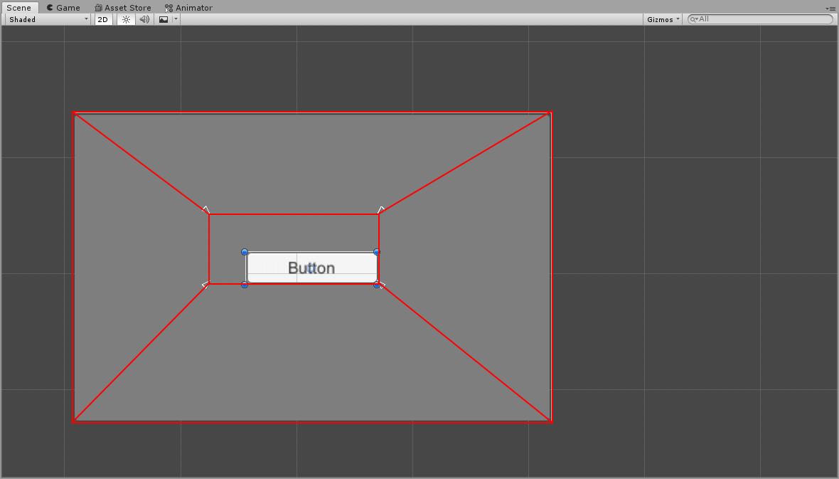 Canvas下创建一个Panel,一个Button作为Panel的子组件(其锚点为内部小红框所示)。锚点的作用是受直接父组件影响的,因此这样我们可以任意调节Panel的大小,来观察Button的锚点对其影响。