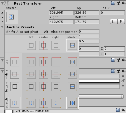 实际上锚点有很多用途,比如锚定屏幕某一个角,或是指定控件随着屏幕缩放。在RectTransform左上角,它内置了一些Anchor的预设布局,我们可以直接选用。