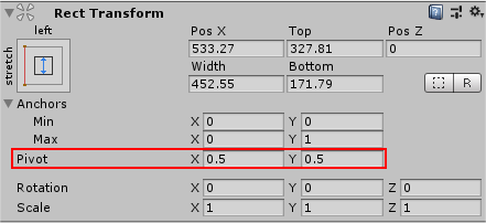 在顶部工具栏中,将Center模式改为Pivot模式,我们就可以通过拖动修改UI组件的中心点了。