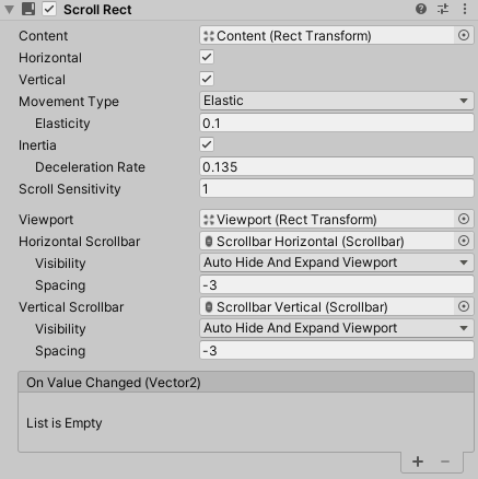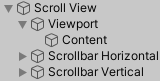 其中,Viewport就是作为视口的对象,它上面添加了一个Mask组件,因此能够实现遮住长宽在视口之外的子对象部分的功能;Content就是我们需要显示的内容;两个Scrollbar对应水平和垂直的滚动条,如果我们不需要可以将其删除。