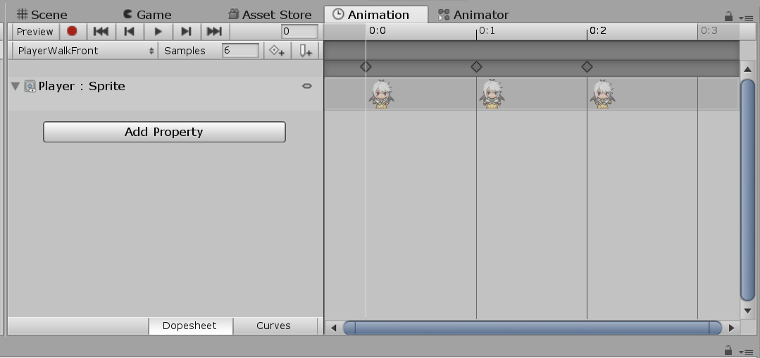 上图是Animation视图,用于创建序列帧动画。点击Create New Clip...,Unity要求我们保存为一个动画文件,然后选中几个序列帧图片拖进去,这样就很方便的创建了一个序列帧动画。创建位移/缩放/旋转动画也很方便,选择一个关键帧,点击左上角红色圆点按钮,直接在Scene中改变Sprite,所做的改变就会自动记录到关键帧中,Unity会自动创建补间动画。