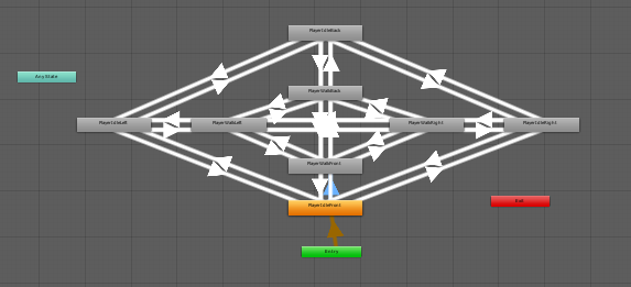 有时候我们不希望通过设置状态机参数触发状态转移实现动画切换,而是希望直接通过代码调用某个动画。这种情况很常见,比如玩家4方向行走序列帧,共有4方向,行走/停止8个动画,几乎每两个动画之间都有状态转移关系,如果设置动画状态机就要拖拽64条转移线(实际情况肯定不止8个动画),这太麻烦了,这种情况说白了就是控制流程根本就不是个状态机。强行使用状态机,最后结果很可能搞成如下图所示的样子: