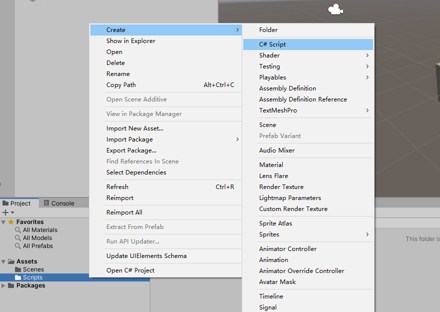 在Unity编辑器中,我们可以在项目资源面板里新建一个Scripts文件夹,便于存放我们所有的游戏脚本。在文件夹上右键Create -> C# Script,可以创建一个C#脚本。创建完成后,将其拖放到我们需要操作的游戏对象上即可。