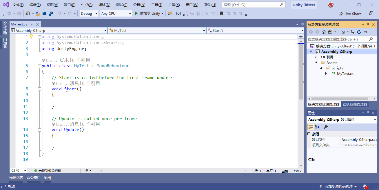 在脚本资源上双击,即可打开我们配置好的集成开发环境,我这里使用的是微软的Visual Studio(社区版免费,推荐),当然Unity同时也支持Jetbrains Rider(139$/year,功能不成熟,不推荐)和VSCode(完全免费,推荐),我们可以根据自己的习惯选择。