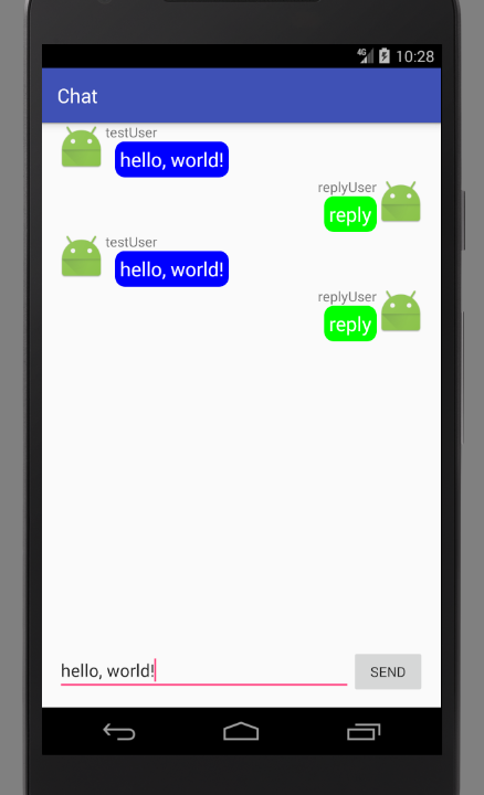 这里因为我们要刷新ListView的数据,需要调用adapter.notifyDataSetChanged(),因此自定义了一个类继承了BaseAdapter。注意这里我们为所有的item划分了两类:TYPE_SELF和TYPE_OTHER。利用缓存时,如果分类正确且缓存存在,才利用缓存,否则都是创建新的item。