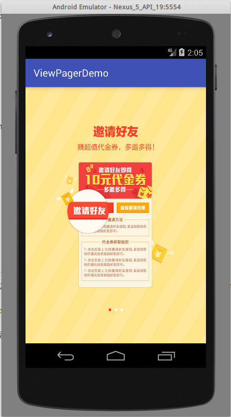 上面的例子比较偷懒,下面的三个小圆点直接画到了图上,那么如果向自己实现,我们需要直到当前ViewPager滑动到了第几页。我们可以使用OnPageChangeListener。