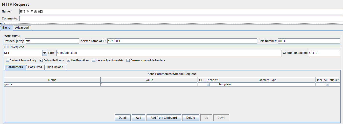 其实上面图中配置的就是一个GET请求,我们请求了http://127.0.0.1:8081/getStudentList接口,还传了一个URL参数grade。