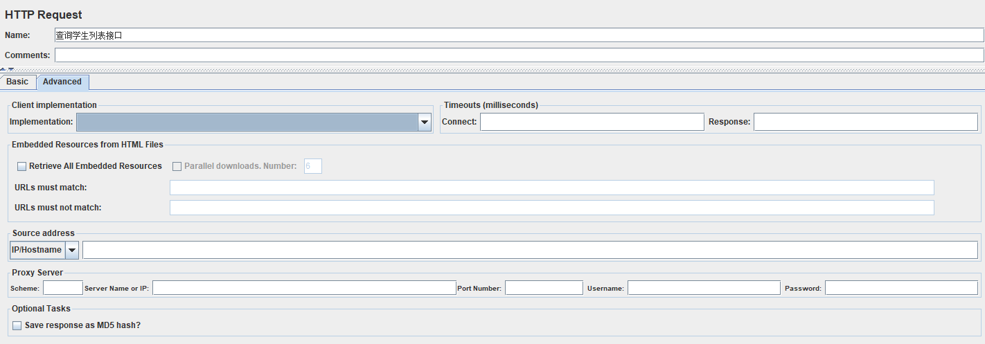 Advanced标签中包含一些高级的配置信息,包括客户端库(Apache HTTP Client或是Java的HttpUrlConnection)、超时时间、来源地址、代理模式等,一般来说较少更改这些配置。