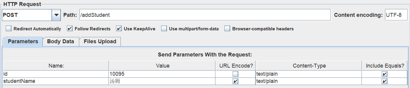 对于表单请求,Jmeter中类似GET请求,我们需要把表单参数写在Parameters里,其中内容就是表单数据的键值对。