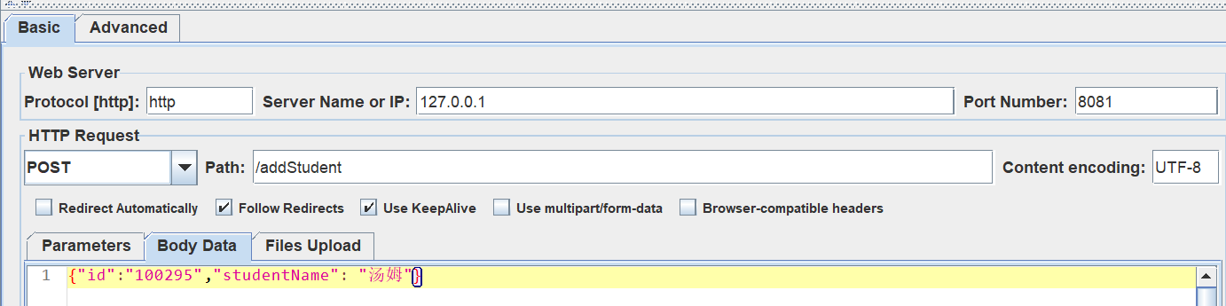 对于JSON请求,额外需要配置一个HTTP请求头Content-Type,值为application/json。然后我们直接把JSON黏贴到HTTP采样器的Body Data里就可以了。