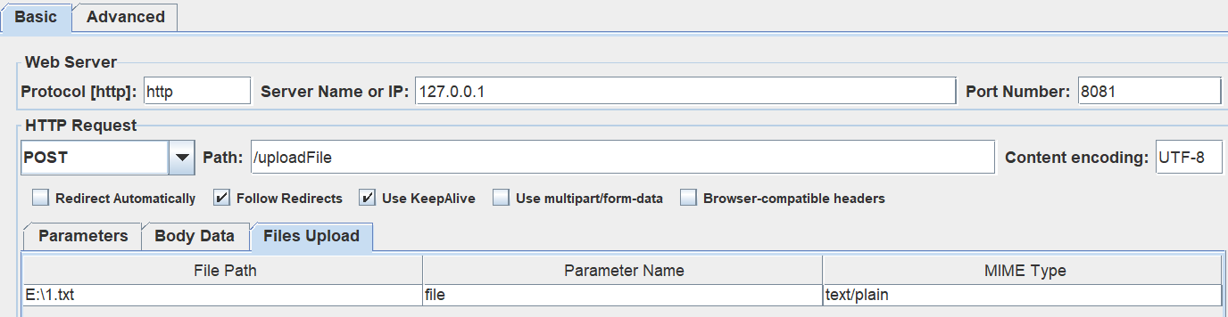 文件上传请求一般都是使用multipart/form-data表单实现的。对于这种文件上传,我们需要在Files Upload标签中添加一个文件,我们可以点击Browse...按钮进行添加,其中Parameter Name是表单的键,MIME Type是文件类型。