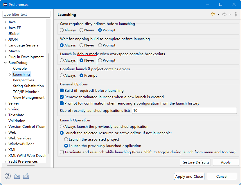Eclipse中包含许多视图,如Java视图、JavaEE视图等,Debug时也有一个视图。Eclipse默认会在断点起作用是自动跳转到Debug视图,然而这个设计很不好,我们边开发边调试,视图会来回闪烁切换,需要改哪行都找不到了,建议关闭自动跳转功能,将Debug工具条、变量查看面板等统一放在Java或JavaEE视图。该设置在Run/Debug -> Launching面板。