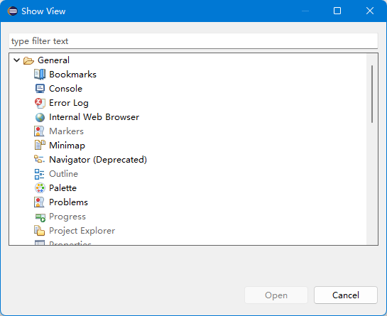 Eclipse中,可以任意拖拽、关闭的面板叫做View,我们点击菜单Window -> Show View -> Other...,即可看到所有可以启用的菜单,我们可以将其拖放到任意位置。
