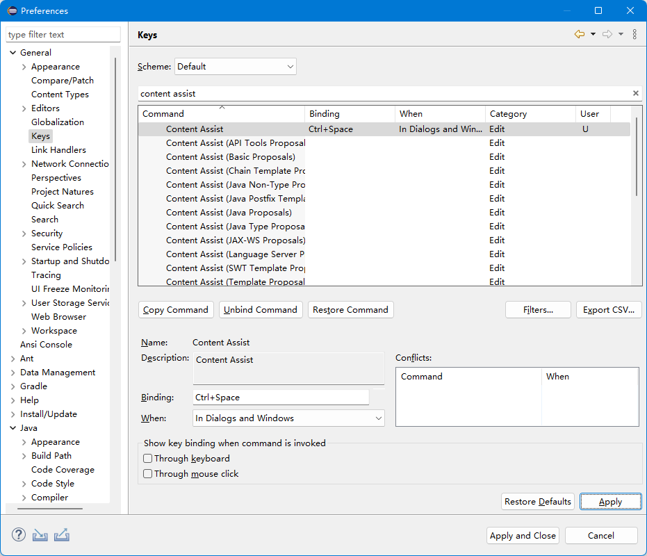 Eclipse默认情况下,使用Alt+/触发代码提示,这个键位非常奇葩,个人建议修改为Ctrl+Space。设置位置在General -> Keys面板,搜索Content Assist命令。