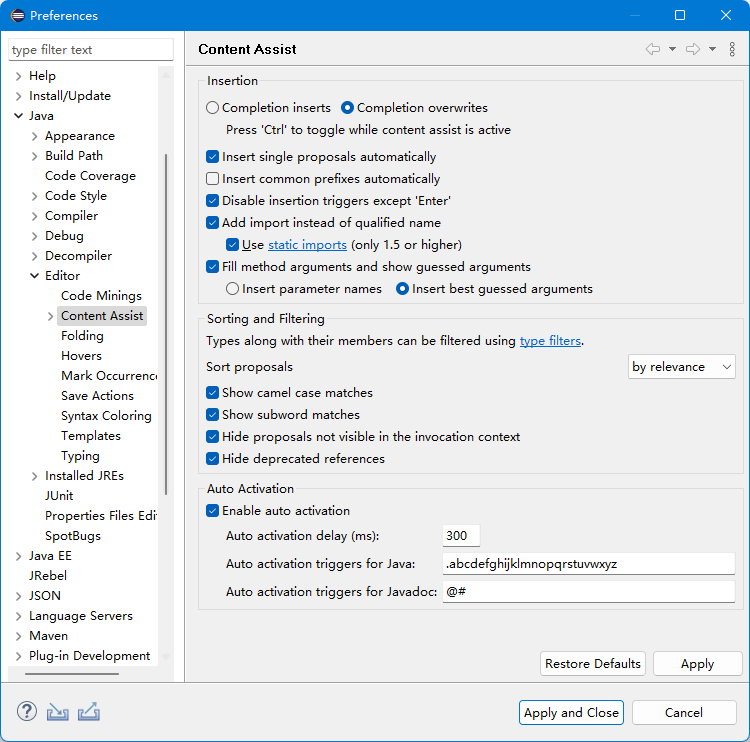 Eclipse默认只有.字符后会自动触发代码提示,可能是出于性能考虑,如果我们电脑的性能不错,触发字符建议改为.abcdefghijklmnopqrstuvwxyz。设置位置在Java -> Editor -> Content Assist面板。