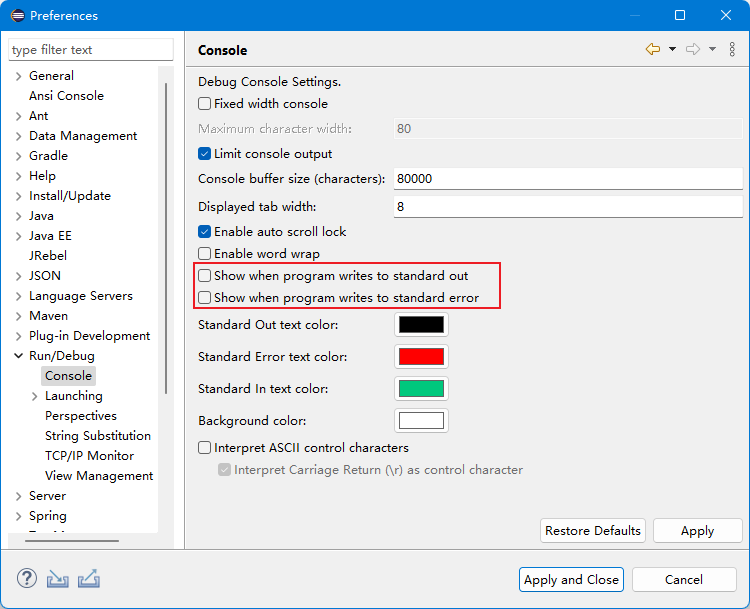 Eclipse有一个闹心的特性,程序启动着的时候,如果有控制台输出(stdout或stderr),选项卡就会自动跳到Console上,页面闪来闪去,让人不胜其烦。可以通过设置面板Run/Debug -> Console修改,取消勾线如下图两项。