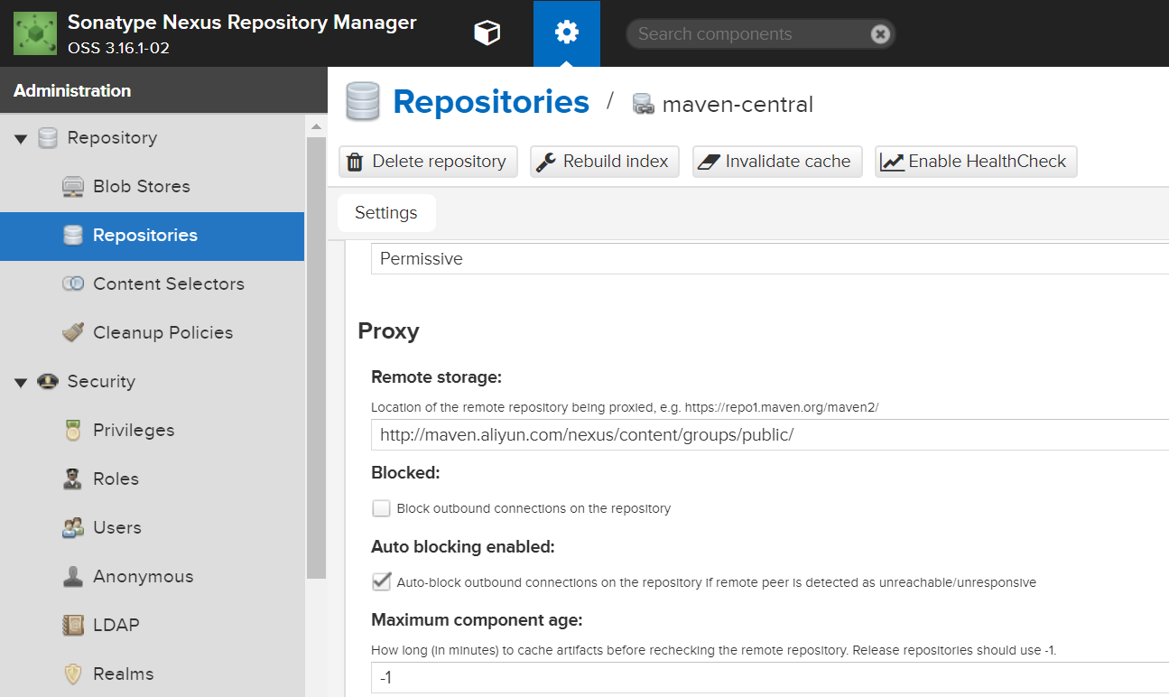 后期补充:我发现使用阿里云的镜像总是出现报错的状况,导致Nexus上和本地上各种下载不完全,引起了很难搞的问题,原理不明。默认的Maven中央仓库虽然慢,但很少报错(即使报错多清掉缓存试几次也就好了),只要第一个人依赖下载完成,之后其它人员下载时就非常快了,因此还是不建议更换默认的仓库。