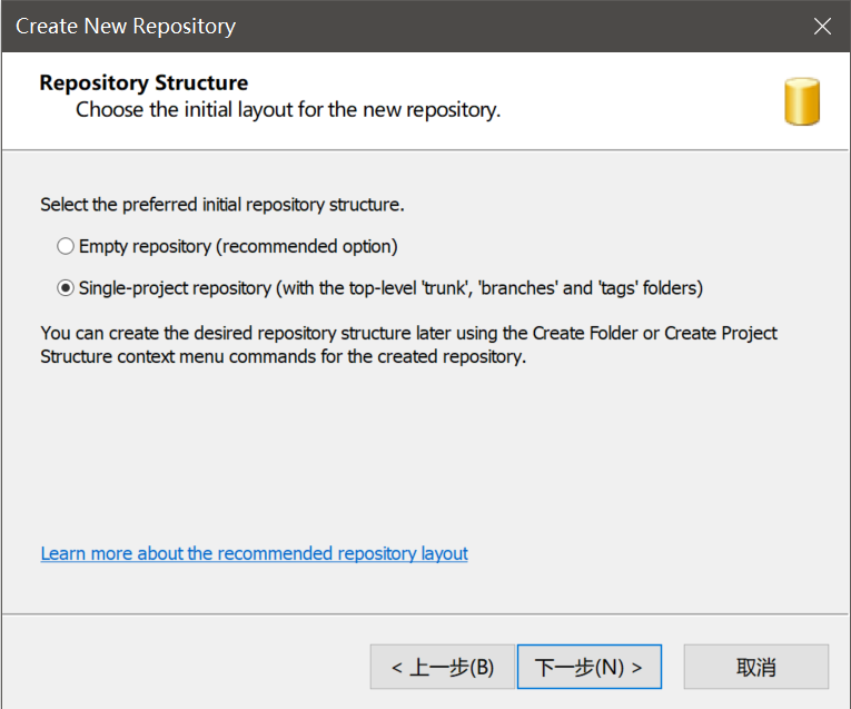 注意:我们新建工程时,如果需要使用分支功能,需要选择第二个选项,该选项会为我们自动创建分支管理相关的文件夹。