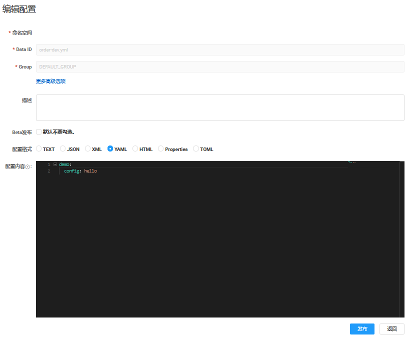 在nacos控制台中,我们可以创建对应的配置项,比如我这里创建了配置项order-dev.yml,我们可以将其理解为一个配置文件,注意配置的DataId需要和微服务中application.properties中引入的配置文件名匹配,否则配置是无法正确加载的,SpringCloud工程通常使用Properties和YAML两种配置格式,我们对应创建所需的格式,并编写配置数据即可。