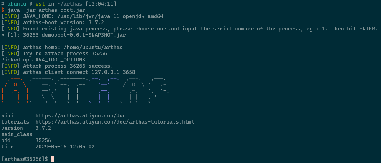运行成功后,根据提示选择JVM进程,即可将Arthas附加到要监控的应用上了。