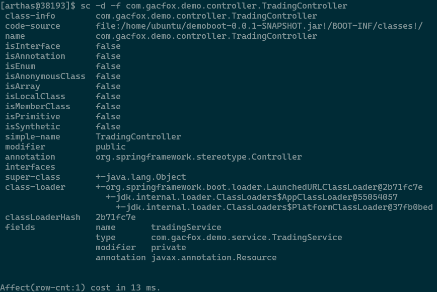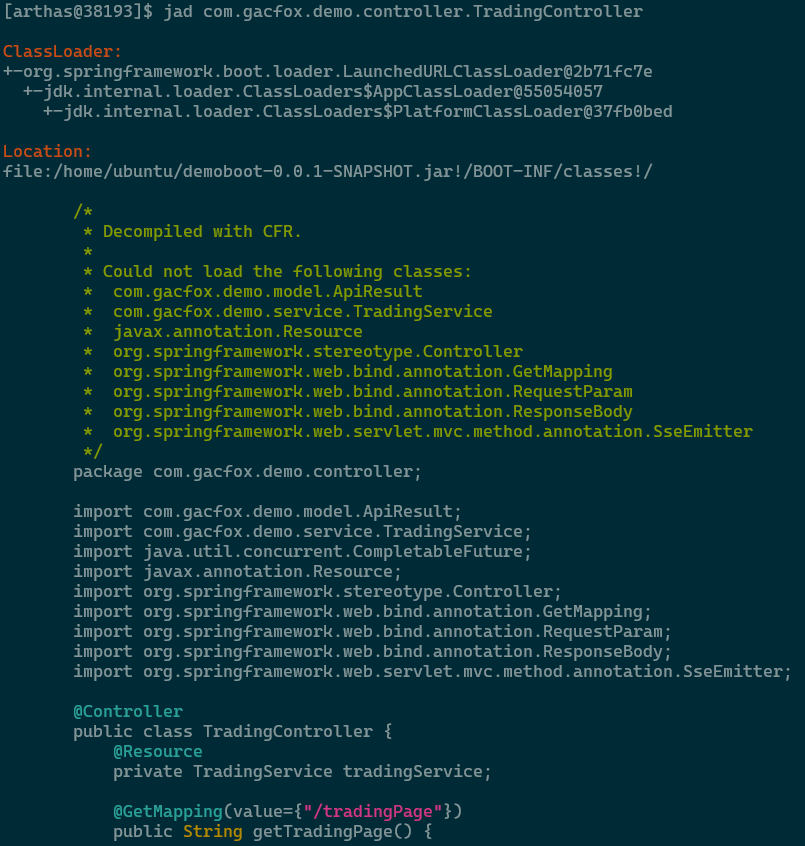 Arthas中,我们可以查看一个类的各种信息,甚至还能直接查看反编译代码,对于定位那些源码不明的类文件存在的问题很有帮助,下面例子我们查看了TradingController类的信息。