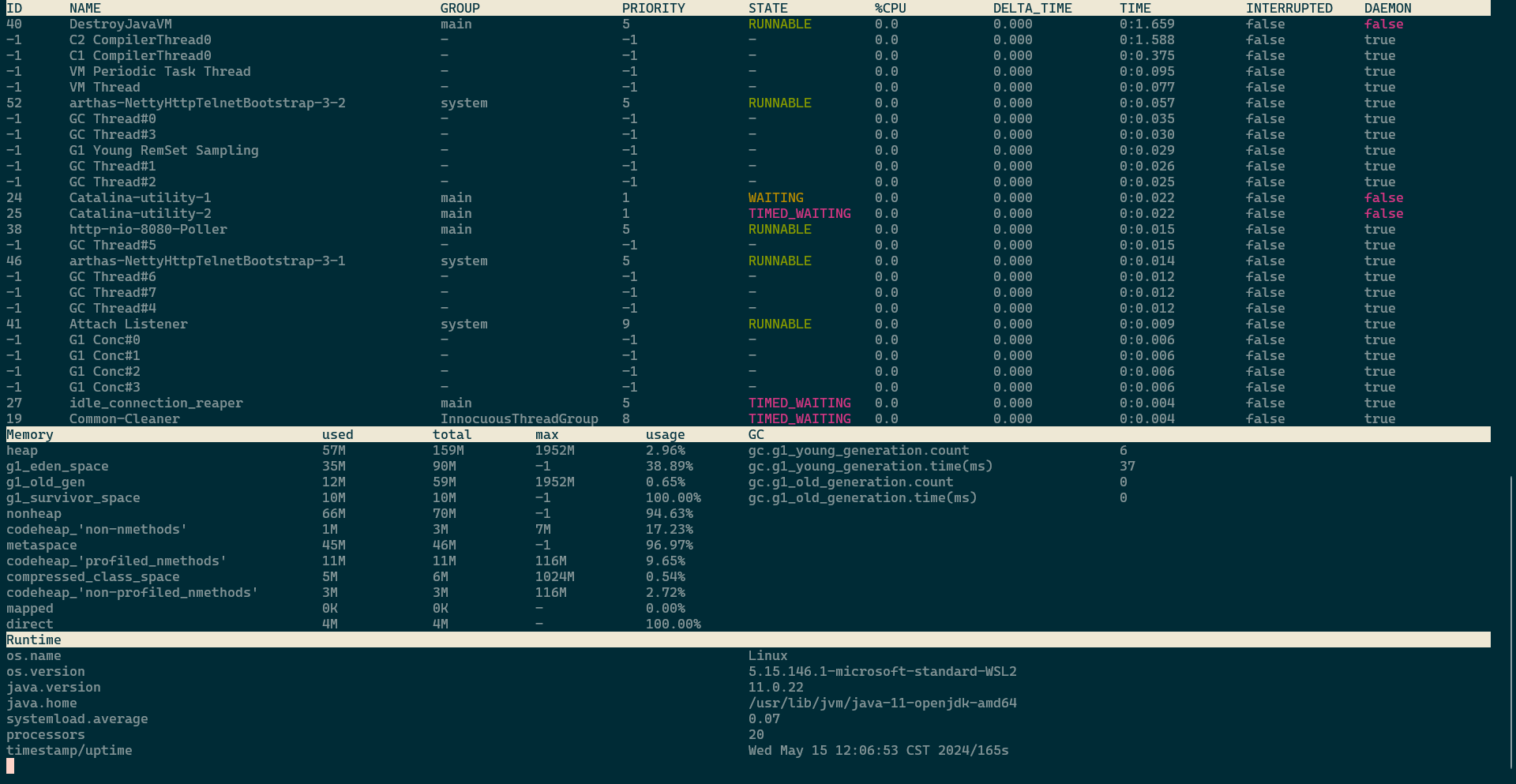 在Arthas的Shell中输入dashboard即可查看Dashboard监控面板。