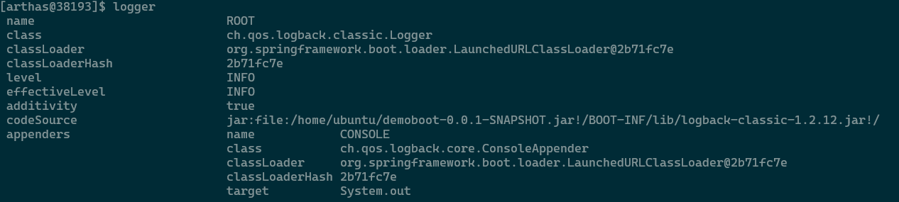 在Arthas的Shell中输入logger命令,我们会看到类似如下输出。