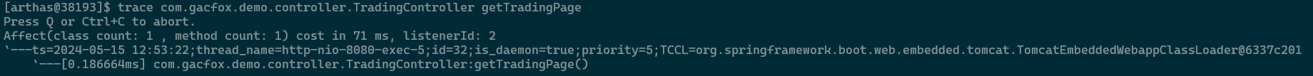 这里假设我们监控的是com.gacfox.demo.controller.TradingController类的getTradingPage方法,例子命令的监控情况如下图(这里我们手动触发了一个方法执行)。