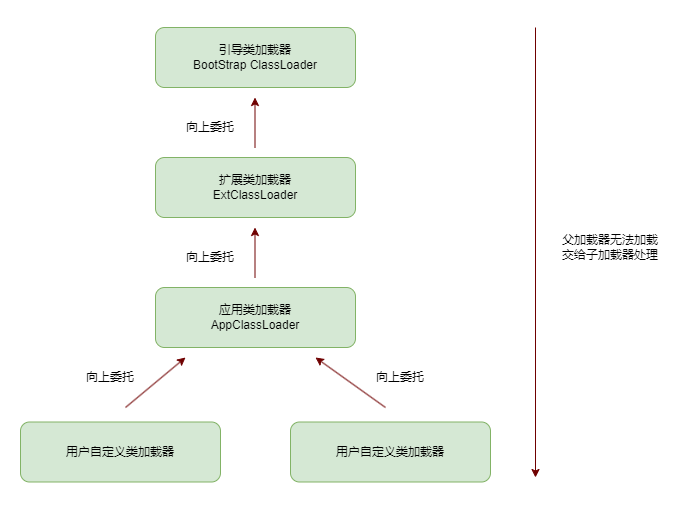 - 如果父加载器还存在其他父加载器,则进一步向上委托,请求最终将到达顶层的引导类加载器