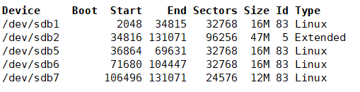 图中我们可以看到有两块硬盘,/dev/sda是已经安装好的,被划分为了若干分区,而另一块硬盘是/dev/sdb,容量64MB,还未格式化和分区。