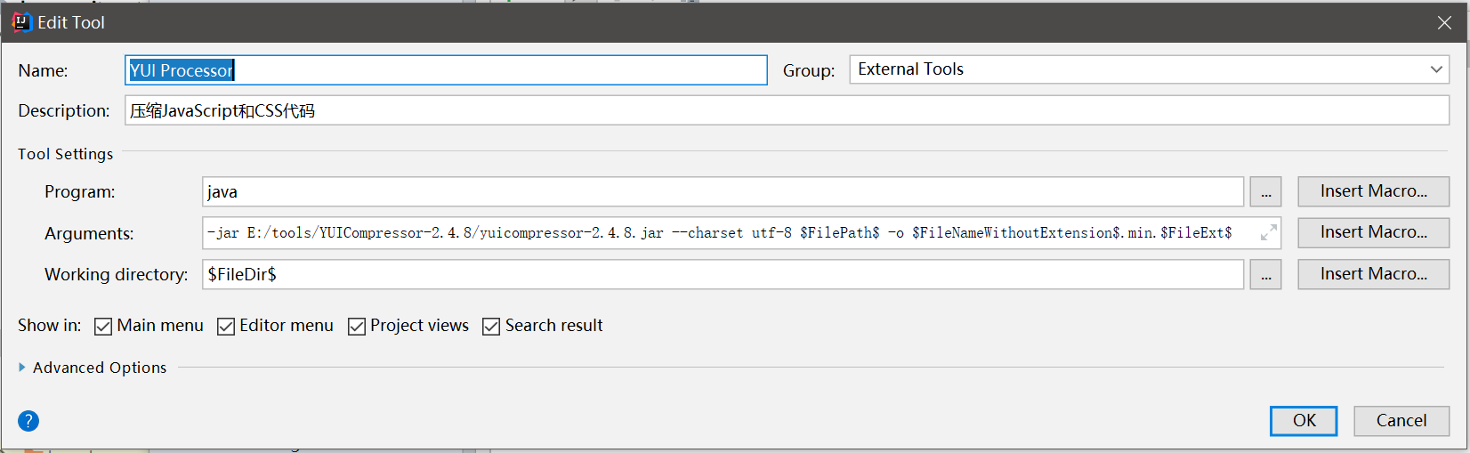 我们可以把YUI Processor配置到IntelliJ IDEA的External Tools中,这样我们编写代码后,就能很方便的直接调用工具进行压缩,页面上直接引入压缩后的代码文件即可,非常方便。
