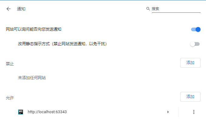 我们在浏览器设置中可以找到如下图的配置功能(图中是Chrome浏览器),供我们修改某个网站的通知设置: