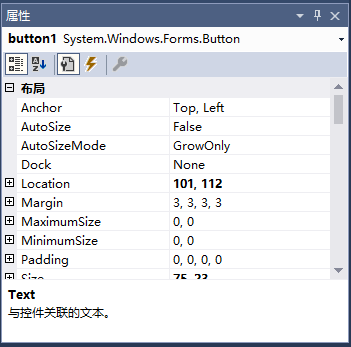 在右下角中修改各种属性,这个并没有什么难度,Visual Studio中甚至都有属性的中文说明,这里就不展开介绍了。Winform中的属性很多,不认识的可以参考文档。