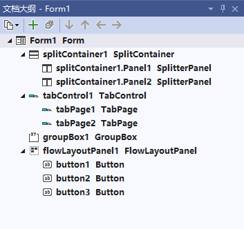 如果我们的界面比较复杂,纯靠设计器可能比较难以理清控件的层次结构。Visual Studio中点击菜单栏视图->其他窗口->文档大纲,我们可以打开控件大纲窗口,方便我们查看当前窗体中的控件层次结构。