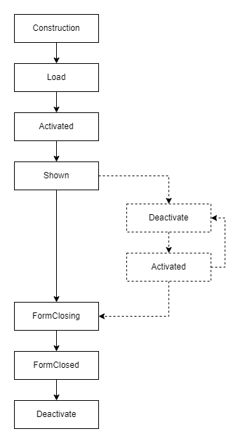 窗体打开阶段:执行窗体构造函数时,新的窗体对象就会被激活,窗体初始化过程中首先会调用设计器自动生成代码中的InitializeComponent方法来初始化所有子控件,这个方法是由Visual Studio维护的,我们不应修改这个方法的任何行为。如果窗体包含一些其它初始化逻辑,我们应该在Load()生命周期函数中编写。随后窗体将被激活,此时Activated()会被回调。窗体激活后,Shown()会被触发。